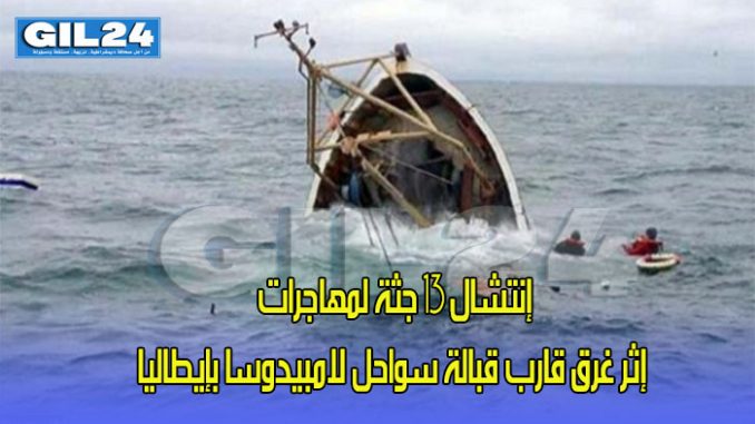 ذكرت كالة الأنباء (أنسا) ان خفر السواحل الإيطالية إنتشل 13 جثة لمهاجرات، عصر اليوم الإثنين، فيما لايزال نحو عشرة أشخاص في عداد المفقودين، إثر غرق قارب كان يقلهن ليلة ـ الأحد الاثنين قبالة جزيرة لامبيدوزا جنوب البلاد.