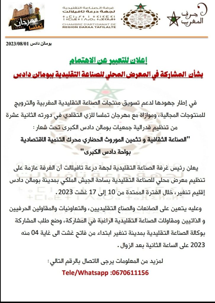 يعلن رئيس غرفة الصناعة التقليدية لجهة درعة تافيلالت أن الغرفة عازمة على تنظيم معرض محلي للصناعة التقليدية بساحة الجيش الملكي بمدينة بومالن دادس إقليم تنغير، خلال الفترة الممتدة من 10 إلى 17 غشت 2023.