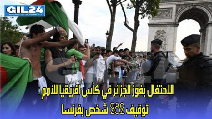 أعلنت وزارة الداخلية الفرنسية اليوم الاثنين عن توقيف 282 شخص عقب الاحداث التي تخللت احتفال المناصرين الجزائريين بفرنسا بتأهل المنتخب الوطني الجزائري الى نهائي كأس افريقيا للأمم بنتيجة 2-1 على فريق نيجيريا . و قد خرج ألاف الجزائريين ليلة الاحد الى الاثنين الى شوارع العديد من المدن الفرنسية احتفالا بهذا الفور. و أوضحت الوزارة أن 249 شخصا من مجموع الموقوفين تم وضعهم رهن الحبس للتحقيق و أن هذه التوقيفات تعود ” اساسا” الى الاحداث التي وقعت خلال الاحتفال بفوز الجزائر اضافة الى بعض الانزلاقات التي حدثت خلال احتفالات العيد الوطني الفرنسي يوم 14 يوليو.