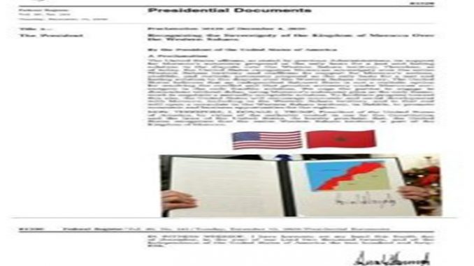 نشرت الجريدة الرسمية للولايات المتحدة الامريكية، الثلاثاء، المرسوم الرئاسي الذي يعترف بسيادة المغرب على الصحراء.