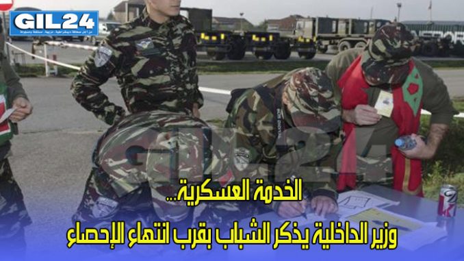 أصدر وزير الداخلية بلاغا بخصوص عملية الإحصاء المتعلق بالخدمة العسكرية برسم سنة 2019، بلاغ وزير الداخلية يذكر الشباب الذين تمت دعوتهم لملء استمارة الإحصاء الخاصة بالخدمة العسكرية والذين لم يقوموا لحد الساعة بملء استماراتهم، أن الفترة المخصصة لعملية الإحصاء ستنتهي يوم الجمعة 7 يونيو 2019 في الساعة الثانية عشرة ليلا.