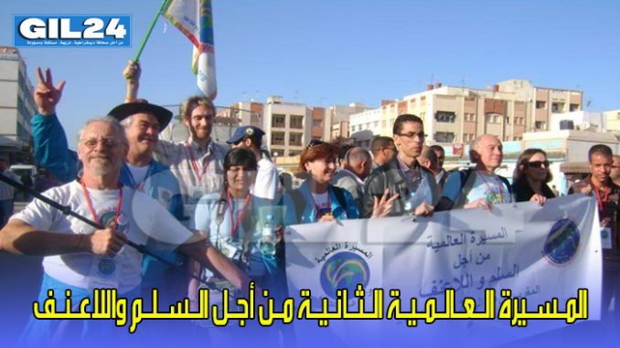 وأخيرا تدخلت “مارتين ســيـكــاردْ ” رئيسة منظمة عالم بدون حروب وبدون عنف، وكان تركيزها على عالم خال من الأسلحة النووية،هي الأخرى ذكرت أن هناك جهات متربصة تعمل جاهدة لكي يستمر العنف والحروب ، كما ذكرت بضرورة ترسيخ قيم التربية والثقافة من الأسرة إلى المؤسسات التعليمية ، وبخصوص نزع الأسلحة النووية تقول سيكارد إنها نجحت في الدفع بمنظمة “اليونيسكو” لكي تتبنى ملف الأسلحة النووية، كما لم يفتها أن تذكر بمواضيع أخرى مثل البيئة والتغييرات المناخية والاحتباس الحراري وحتى نفعل شعار : la terre ,la maisin de tous . أما ما ميز المسيرة العالمية الأولى في محطتها في المملكة المغربية ، فقد جابت عدة مدن مغربية من الشرق إلى الغرب ومن الشمال إلى الجنوب، وأهم حدث فيها أنها حطت رحالها في صحرائنا المسترجعة بمدينة العيون بمشاركة 97 دولة من القارات الخمس، وهو ما اعتبره عدة ملاحظين ومتتبعين انتصارا لقضيتنا الوطنية الأولى، لأن النظام الجزائري أراد أن تمر هذه المسيرة أولا عبر الجزائر، وكانت النية المبيتة هي استغلال هذه المسيرة من خلال برمجة رحلة نحو تندوف والرابوني للترويج لأطروحات عصابة البوليساريو لكنهم فشلوا، كما الجزائر لم تشارك في هذه المسيرة العالمية .