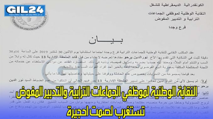 البيان استغرب لموقف الادارة الجماعية ولعدم تحمل الرئيس احجيرة لمسؤوليته المتمثلة في الحماية الجسدية والمعنوية لموظفيه. وعلى ضوء ذلك قرر المكتب النقابي لموظفي الجماعات الترابية والتدبير المفوض خوض وقفتين احتجاجيتن واحدة يومه الخميس 3أكتوبر ببهو جماعة وجدة وأخرى في العاشر من اكتوبر امام الملحقة الادارية 13