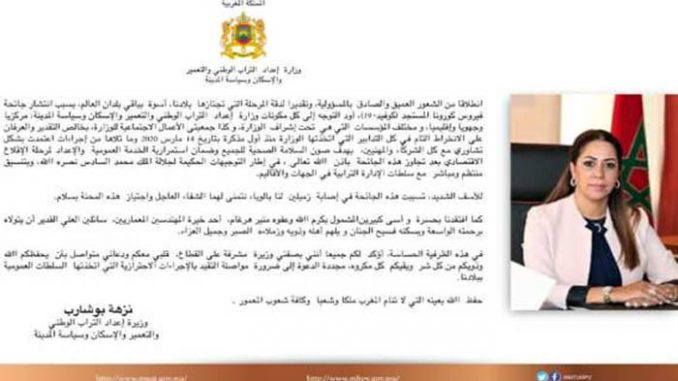 و لم تتخذ الوزارة الإجراءات، التي كان من المفروض اتخاذها في مثل هذه الحالة، من تعقيم مقر الوزارة، وهي عمليات قامت بها حتى أفقر الجماعات القروية في المغرب، وتوفير المظهرات، و اتباع البرتوكول الصحي الذي وضعته وزارة الصحة لحماية العاملين، بمختلف القطاعات الحكومية من الإصابة، بعدما تركت الحبل على الغارب، إلى أن أصيب موظفان اثنان بالفيروس اللعين، لتخرج الوزيرة، متأخرة، كالمعتاد، وتقوم بتوجيه كلمة للموظفين عبر الموقع الإلكتروني للوزارة تعلن فيها الخبر و تدعو الموظفين إلى الالتزام بالإجراءات الوقائية وتدعو للموظفين بالشفاء، من دون أن تسأل نفسها ماذا وفرت  لهم الوزارة لحماية أنفسهم؟