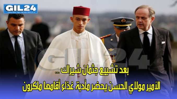 حضر ولي العهد الأمير مولاي الحسن الاثنين 30 شتنبر الجاري بقصر الإليزيه، مأدبة غداء أقامها رئيس الجمهورية الفرنسية إيمانويل ماكرون على شرف رؤساء الدول والحكومات، الذين حضروا المراسيم الرسمية لتشييع جثمان الرئيس الراحل جاك شيراك.