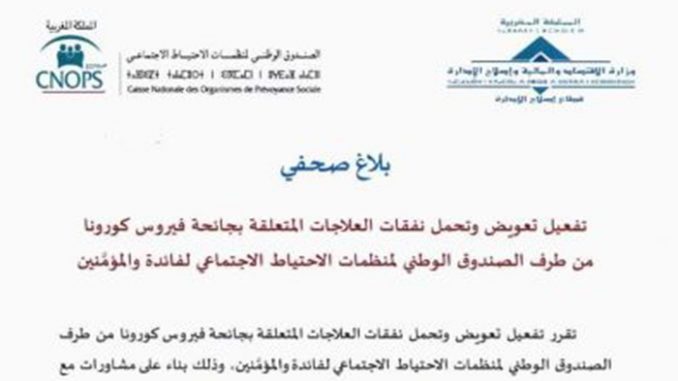 افاد بلاغ مشترك لوزارة القتصاد والمالية وإصلاح والصندوق الوطني لمنظمات الاحتياط الاجتماعي، بأنه تقرر تفعيل تعويض وتحمل نفقات العلاجات المتعلقة بجائحة فيروس كورونا من طرف الصندوق الوطني لمنظمات الاحتياط الاجتماعي لفائدة المؤمَّنين.