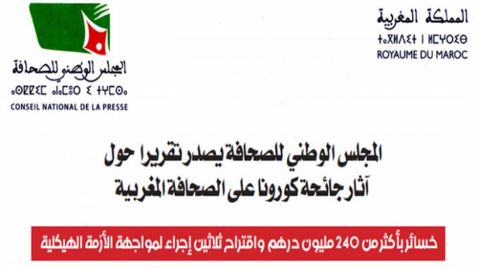 أنجز المجلس الوطني للصحافة تقريرا حول آثار جائحة كورونا على قطاع الصحافة في المغرب، وارتكز هذا التقرير على بحث تم في الفترة الممتدة من 25 ماي إلى 4 يونيو، من خلال عينة عشوائية تمثيلية تتشكل من 30 عنوانا، وكذا من خلال الاستماع إلى كل الفاعلين في المجال، ومنهم الفيدرالية المغربية لناشري الصحف واتحاد المعلنين المغاربة واتحاد وكالات الاستشارة في الاتصال وشركة التوزيع سابريس ومطبعتي الصحف الأكبر في المغرب، بالإضافة إلى استقراء آخر الدراسات المتعلقة بالمقروئية والحالة الاقتصادية للمقاولات الصحافية وسوق الإشهار.