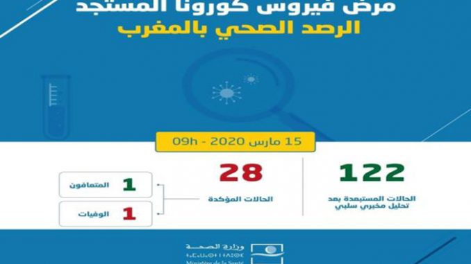 وأعلنت الوزارة، أن عدد الحالات المؤكد إصابتها بفيروس كرورنا بلغ 28 حالة، منها حالة واحدة تم شفاؤها وغادرت المستشفى، وحالة وحدة اخرى توفيت وهي لسيدة مغربية مسنة.