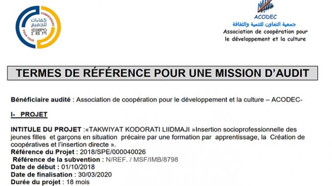 تعلن جمعية التعاون من أجل التنمية والثقافة (ACODEC) فتح باب الترشيح لتعيين مدقق (مهمة التدقيق) لإجراء مراجعة وإعداد تقرير عن مشروع “تقوية قدرات الإدماج” .