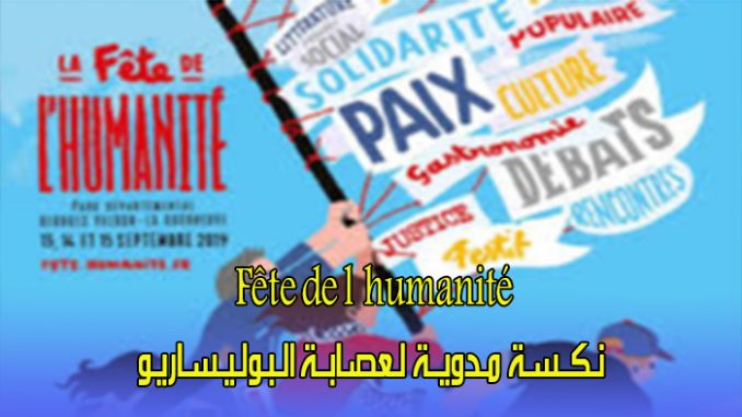 على مدى ثلاثة أيام )13- 14-15 شتنبر 2019( احتضنت مدينة باريس فعاليات مهرجان الإنسانية المنظم من طرف الحزب الشيوعي الفرنسي سنويا، وهي المناسبة التي تجتمع فيها كل الأحزاب اليسارية من كل بقاع العالم، وكذا المنظمات ذات التوجهات الاشتراكية، وكذا التنظيمات المعارضة أو تلك التي تسعى للتحرر بقوة السلاح، وهي الفرصة المتاحة لحركات انفصالية لكي تستعرض عضلاتها وتروج لأطروحاتها العدائية والزائفة كما هو حال عصابة البوليساريو التي دائما- وبدعم وتمويل من العسكر الجزائري- الذي يرى في مثل هذه المناسبات متنفسا لعصابة البوليساريو التي فقدت الكثير من بريقها الزائف الذي كان نظام بوتفليقة يستميت للحفاظ عليه، وللتشويش على حق المغرب في صحرائه.