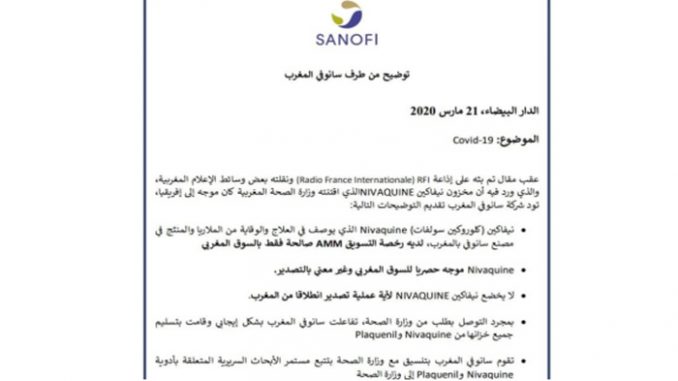 أفادت شركة ‘سانوفي’ المٓغرب، فرع الشركة الفرنسية الشهيرة المتخصصة في صناعة الأدوية، انها سلمت لوزارة الصحة المغربية كافة مخزونها من دواء ‘كلوروكين’ الذي أثبتت التجارب الأولية عبر العالم فاعليته في علاج الإصابة بفيروس “كورونا”