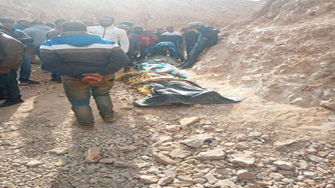 لقي 4 أشخاص مصرعهم و أصيب 6 أشخاص بجروح خطيرة صباح اليوم الثلاثاء، بمنطقة واد الشيخ على الطريق المؤدية لمنطقة تويست التابعة ترابيا لإقليم اجرادة ، إثر انهيار صخري بأحد آبار مناجم الرصاص ، كان بها مجموعة من ساكنة المنطقة ينقبون عن المعادن.