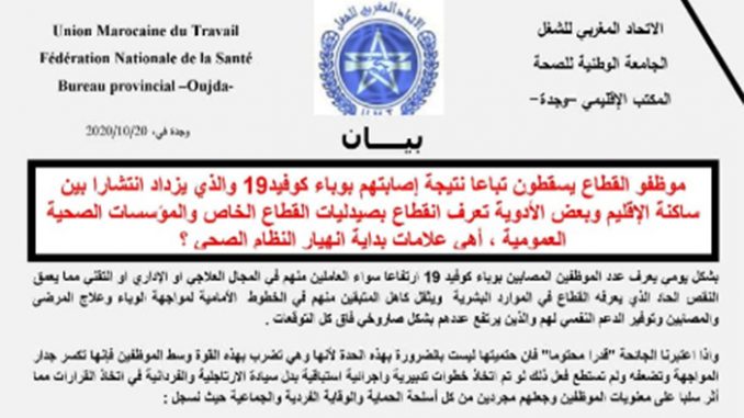 بشكل يومي يعرف عدد الموظفين المصابين بوباء كوفيد 19 ارتفاعاسواء العاملين منهم في المجال العلاجي او الإداري او التقني مما يعمق النقص الحاد الذي يعرفه القطاع في الموارد البشرية  ويثقل كاهل المتبقين منهم في الخطوط  الأمامية لمواجهة الوباء وعلاج المرضى والمصابين وتوفير الدعم النفسي لهم والذين يرتفع عددهم بشكل صاروخي فاق كل التوقعات .