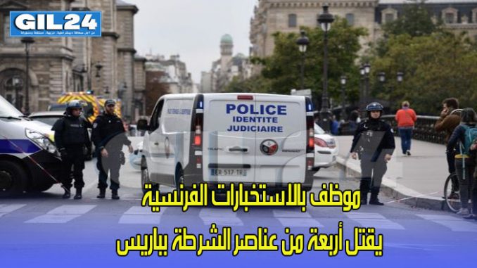 قتل أربعة عناصر شرطة طعنا بالسكين الخميس في اعتداء وقع داخل مقر شرطة باريس ونفذه موظف في المقر عمدت قوات الأمن الى قتله لاحقا، بحسب مصادر متطابقة.
