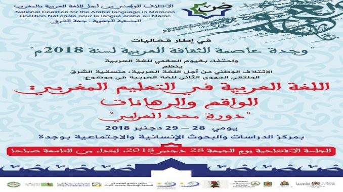 في إطار فعاليات وجدة عاصمة الثقافة العربية لسنة 2018م، وأسبوع اللغة العربية واحتفاء باليوم العالمي للغة العربية، ينظم الائتلاف الوطني من أجل اللغة العربية المنسقية الجهوية للشرق، وتأبينا للأستاذ محمد العرابي، وبشراكة مع وزارة الثقافة والاتصال ومجلس الجهة الشرقية والجماعة الحضرية لوجدة والمجلس العلمي المحلي لوجدة وجامعة محمد الأول والمركز الجهوي لمهن التربية والتكوين وكلية الآداب والعلوم الإنسانية واتحاد كتاب المغرب فرع وجدة ورابطة التعليم الخاص بالمغرب فرع وجدة انكاد الملتقى الجهوي الثاني للغة العربية في موضوع: “اللغة العربية في النظام المغربي: الواقع والرهانات ” يومي 28 و29 دجنبر 2018 بمركز الدراسات والبحوث الإنسانية والاجتماعية وجدة.